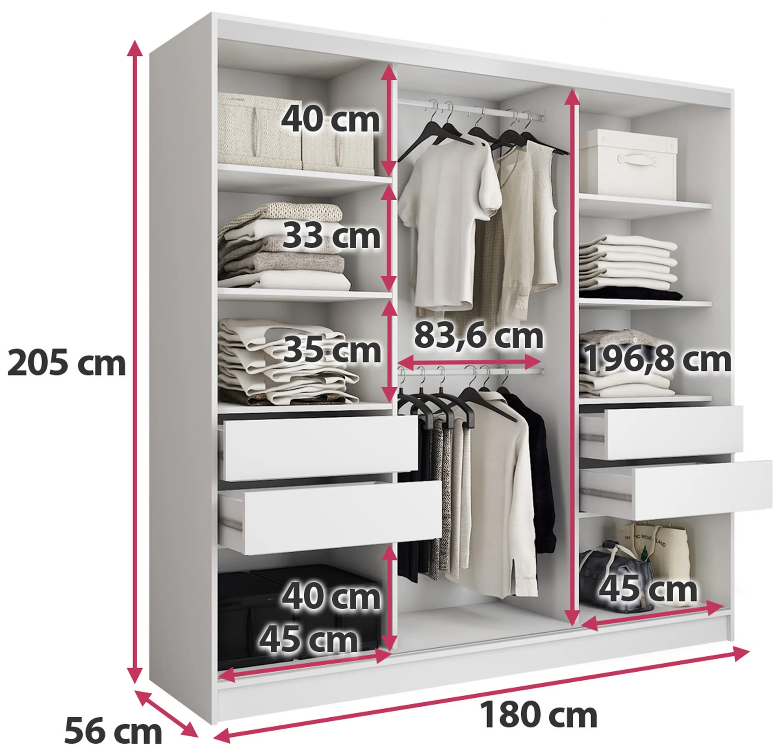 Wszystko się w niej pomieści bez problemu. Nowoczesna szafa przesuwna, prezentuje się bardzo dobrze. Łatwy i szybki montaż. Jednak wyrób z za cienkiej płyty. Przy tych gabarytach płyta 18mm spełniła by swoje zadanie. Płyta 16 mm jest stanowczo za cienka. Mimo wzmocnienia z mojej strony w narożach szafa nie jest stabilna na 100 %. Kolejna kwestia z spowalniaczami do drzwi i szuflad. Niestety ani szuflady ani drzwi nijak się mają do tych udogodnień. Dedykowane przez producenta spowalniacze drzwi nie mieszczą się , a spowalniacze szuflad nie spowalniają. Przyczyna, za ciasno chodzą prowadnice i również nijak się to ma do montażu spowalniaczy szuflady. Czyli zakup bez sensu, a miał ułatwić otwieranie i zamykanie. Reasumując, szafa w tych gabarytach warta tych pieniędzy mimo kilku niedociągnięć. Prezentuje się bardzo dobrze. Zobaczymy jak długo posłuży.