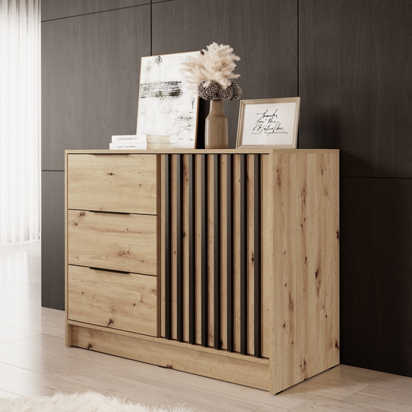 - Korpus oraz front wykonano z płyty laminowanej o grubości 16 mm. Płyta laminowana charakteryzuje się odpornością na zarysowania oraz łatwością w czyszczeniu.
