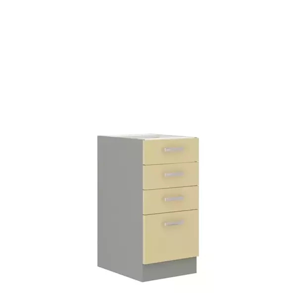 Zarówno w szafkach uchylnych, jak i tych z szufladami zastosowano systemy cichego domykania frontów (poza szafkami narożnymi)