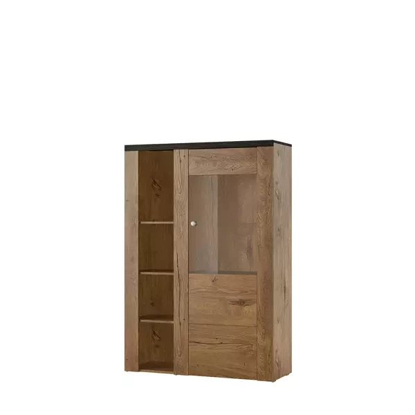 Witryna do salonu o szerokości 50 cm posiada pięć półek, z czego jedną szklaną, widoczną za oszkloną częścią frontu. Stojąca witryna w kolorze dąb artisan