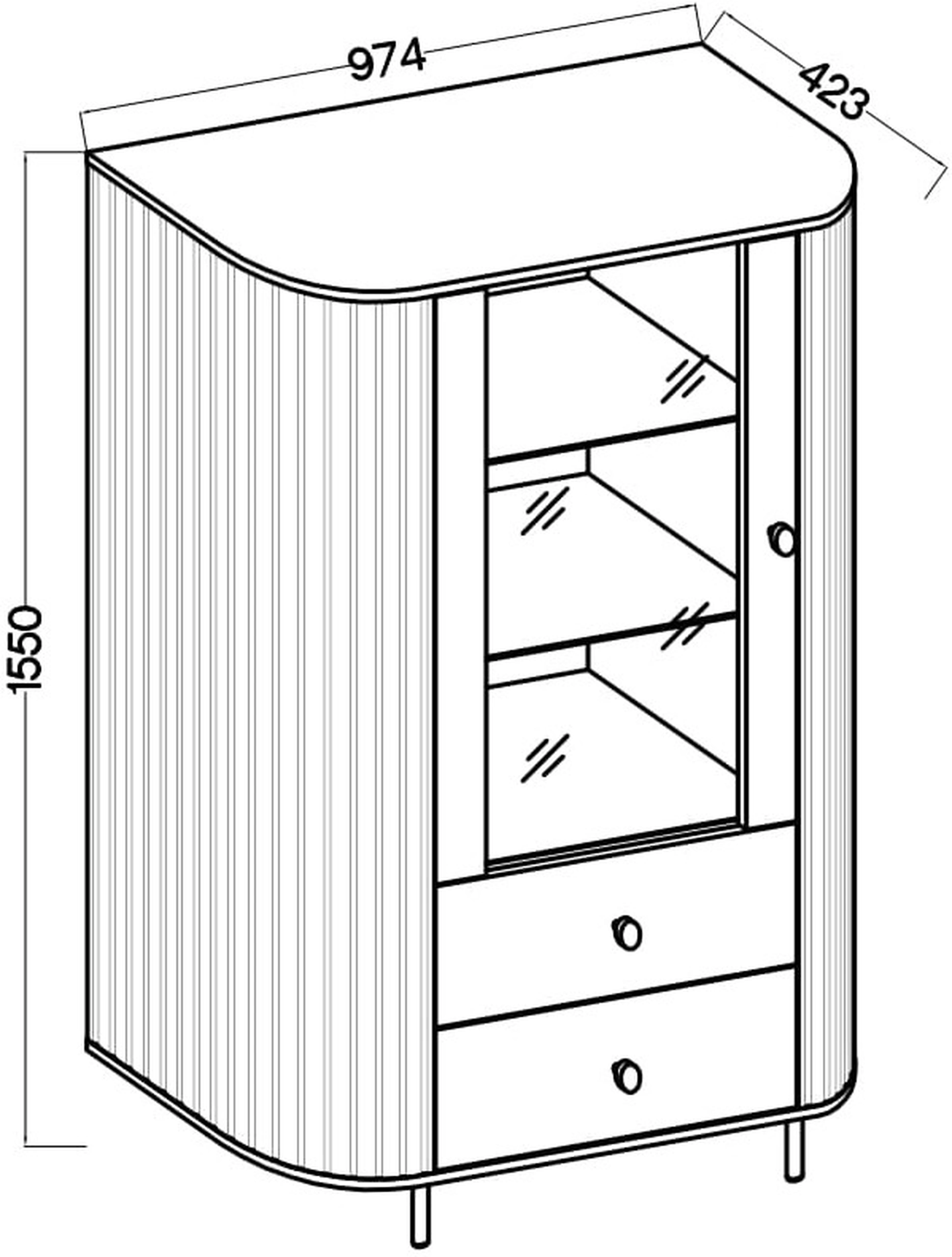 Witryna OVENTO w dekorze dąb Cremona to doskonały wybór dla osób ceniących ciepłe, naturalne wykończenia i elegancką, nowoczesną formę. Szklany front subtelnie eksponuje zawartość, a charakterystyczne frezowania po bokach podkreślają wyjątkowy design kolekcji. Ten model pięknie prezentuje się w salonie, jadalni lub holu, dodając wnętrzu klasy i wyrafinowania.