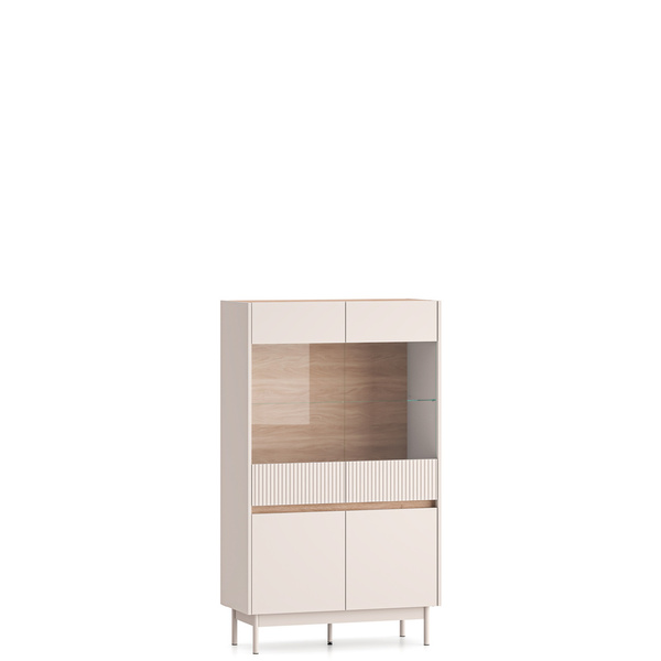Wewnątrz witryny znajdziesz aż sześć półek, które pozwolą Ci na optymalne zagospodarowanie przestrzeni. Jedna z nich, wykonana ze szkła, dodaje elegancji i nowoczesnego akcentu, idealnie eksponując najważniejsze elementy Twojej kolekcji. Reszta półek zapewnia mnóstwo miejsca na przechowywanie różnych przedmiotów, od dekoracji po codzienne akcesoria.