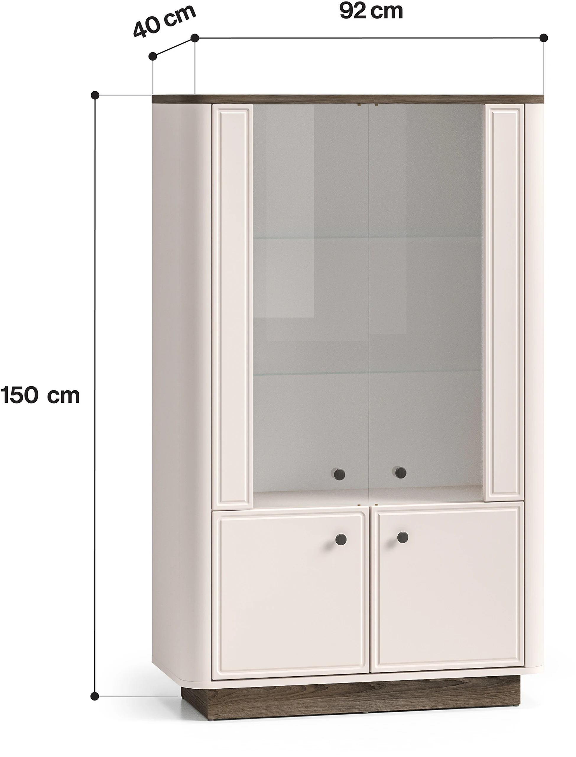 Witryna VILANO wyróżnia się harmonijnym kształtem z delikatnie zaokrąglonymi bokami, dzięki czemu świetnie komponuje się z nowoczesnymi i klasycznymi wnętrzami. Jej wysokość 150 cm sprawia, że nie przytłacza przestrzeni, a jednocześnie oferuje zaskakująco dużo miejsca do organizacji i ekspozycji.