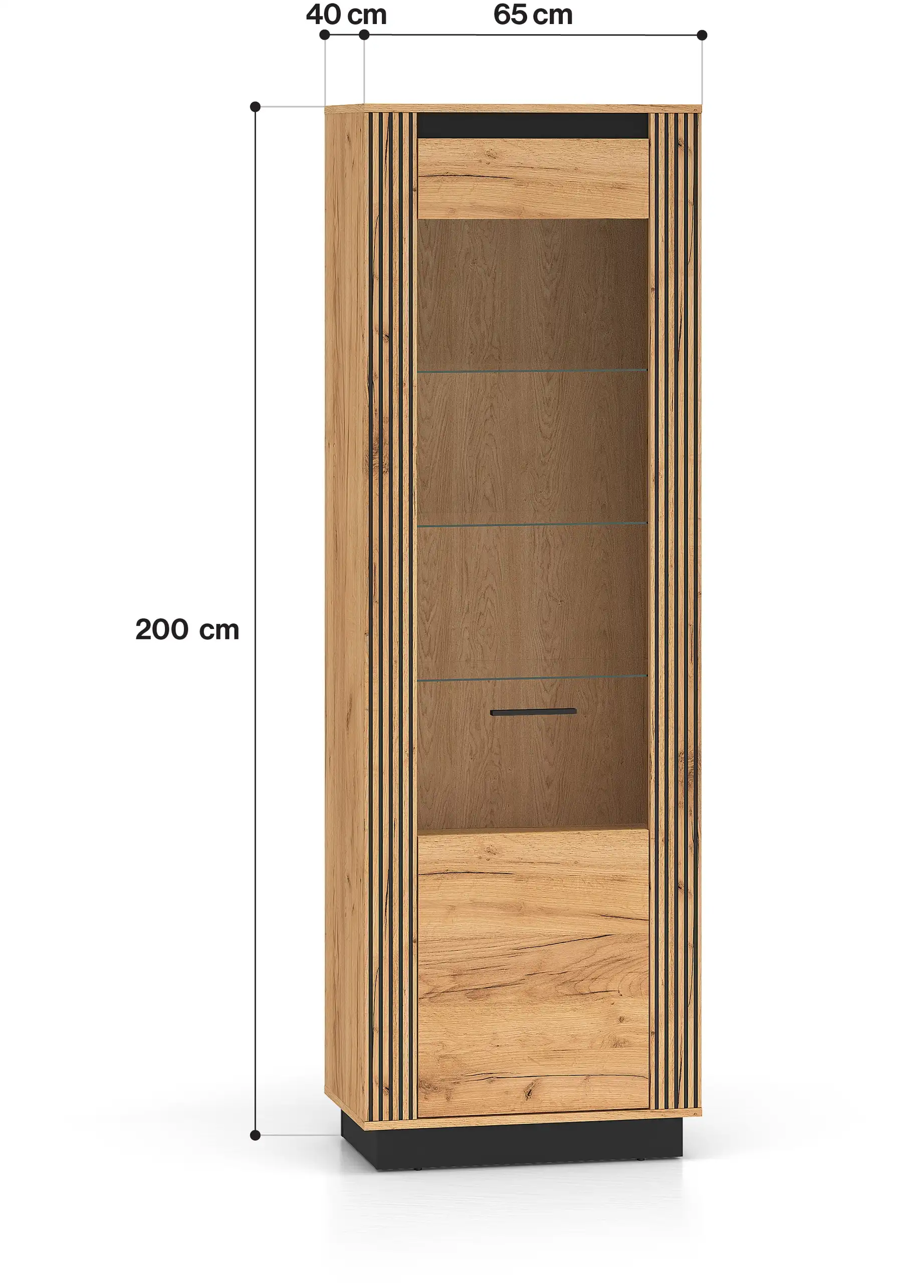 Witryna loftowa UMIO w kolorze dąb craft złoty z czarnymi akcentami to idealny wybór dla miłośników nowoczesnych, industrialnych wnętrz. Dzięki przeszklonym drzwiom i subtelnym lamelom eksponuje dekoracje z klasą, jednocześnie oferując praktyczne miejsce do przechowywania. To połączenie stylu, solidności i komfortu codziennego użytkowania.