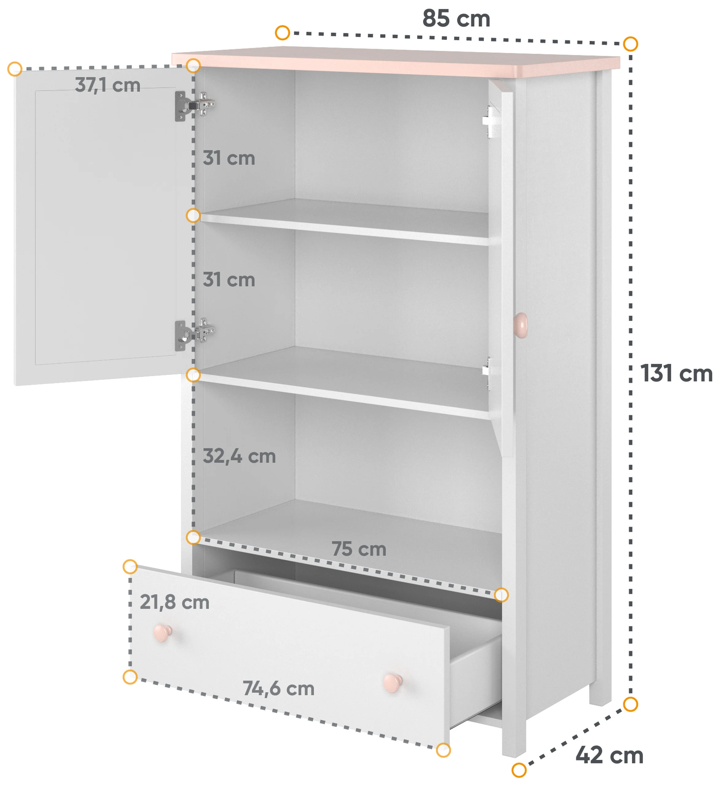 Wysoka komoda dziecięca LUNA w kolorze bieli alpejskiej to nie tylko praktyczny, ale również stylowy mebel, który świetnie sprawdzi się w pokoju dziecięcym. Wyposażona w drzwi z półką u góry oraz otwarty poziom, komoda pozwala na przechowywanie i organizację różnych przedmiotów. Dodatkowo, szuflada osadzona na prowadnicach rolkowych stanowi idealne miejsce na przechowywanie mniejszych przedmiotów.