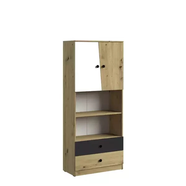 Regał wyposażony jest w drzwi na zawiasach puszkowych, które zapewniają płynne i ciche otwieranie oraz zamykanie. Dzięki temu codzienne użytkowanie mebla staje się komfortowe i bezproblemowe. Drzwi pozwalają na dyskretne przechowywanie przedmiotów, pomagając utrzymać porządek w pokoju.