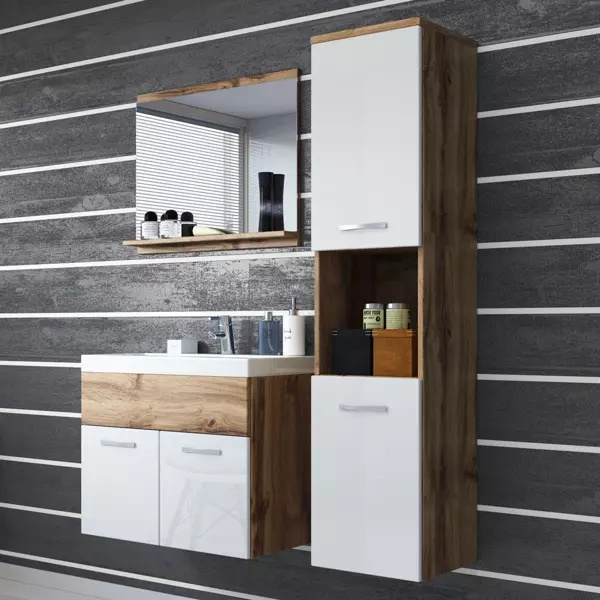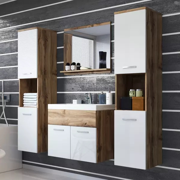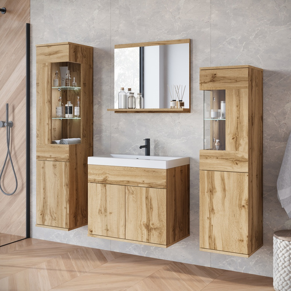 Zestaw mebli łazienkowych NAVARO w kolorze dąb wotan to propozycja dla osób, które cenią ciepło naturalnych odcieni drewna i ponadczasową elegancję. Wykończenie wotan wprowadza do wnętrza przytulny klimat, jednocześnie nadając łazience nowoczesny i stylowy charakter. To zestaw, który łączy w sobie wysoką estetykę z praktycznymi rozwiązaniami do codziennego użytkowania.