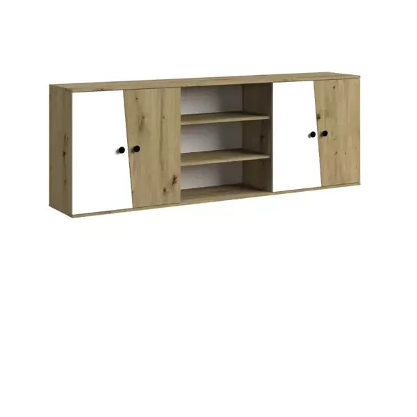 W zestawie znajduje się również pojemna szafka wisząca oraz trzydrzwiowa szafka stojąca na której opiera się biurko z blatem o szerokości 150 cm z trzema szufladami i nadstawką posiadającą oświetlenie LED w ciepłym, pomarańczowym kolorze. W zestawie znajduje się również regał na książki z otwartymi półkami oraz drzwiami.