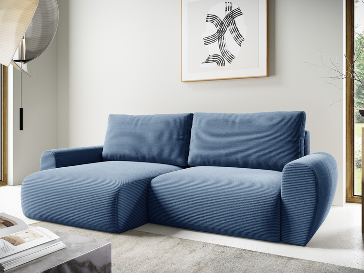 Niebieski narożnik rozkładany na nóżkach z pojemnikiem i funkcją spania APOLLO