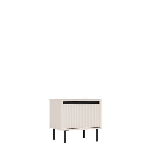 Meble wykonane są z trwałej płyty laminowanej, odpornej na uszkodzenia mechaniczne i codzienne użytkowanie. Zastosowane zawiasy nożycowe w drzwiach oraz prowadnice rolkowe w szufladach zapewniają płynne otwieranie i długą żywotność. Charakterystyczne uchwyty z dekoracyjnych lameli dodają całości unikalnego stylu i tworzą spójną, estetyczną linię mebli.