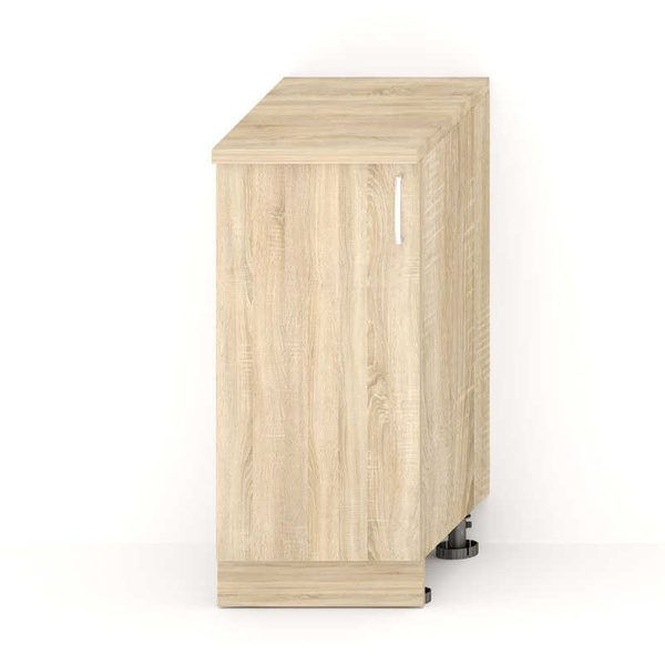 W dolnej części zestawu znajdują się trzy funkcjonalne szafki, które doskonale sprawdzają się podczas codziennych prac kuchennych. Dwudrzwiowa szafka pod zlew o szerokości 80 cm oferuje przestrzeń na kosz na śmieci i środki czystości, pozwalając zachować porządek. Szafka z szufladą i drzwiami (60 cm) to doskonały wybór na przybory kuchenne oraz produkty spożywcze. Szafka pod piekarnik o szerokości 60 cm z dodatkową szufladą to praktyczne miejsce na blachy i akcesoria do pieczenia. Szuflady poruszają się na prowadnicach rolkowych, zapewniając płynność ruchu i ciche otwieranie, a drzwi zamocowane są na trwałych zawiasach puszkowych, co gwarantuje stabilność i trwałość użytkowania.