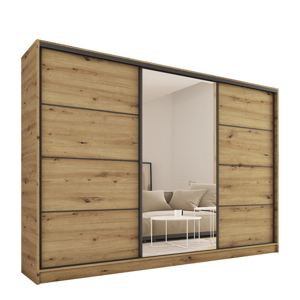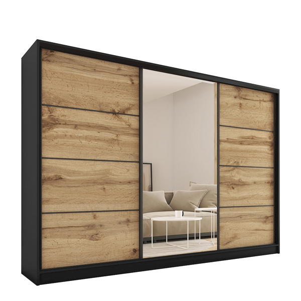 Meble z kolekcji MESSA zachwycają wyrafinowanym wyglądem i subtelnym kontrastem. Ciepły odcień kasztanowego drewna doskonale komponuje się z chłodnymi, antracytowymi akcentami, nadając wnętrzu wyjątkowego charakteru. To zestawienie barw wprowadza do sypialni poczucie przytulności i elegancji. Czarne metalowe uchwyty i nogi podkreślają nowoczesny styl mebli, a jednocześnie zapewniają stabilność i trwałość konstrukcji. Obrzeża ABS chronią krawędzie przed uszkodzeniami, gwarantując nienaganny wygląd na długie lata.