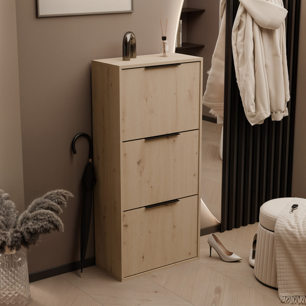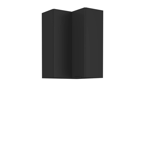 Meble OLVO wykonane są z trwałej płyty laminowanej zabezpieczonej obrzeżem ABS, co gwarantuje odporność na zarysowania i codzienne użytkowanie. Złote, metalowe nogi nie tylko stabilizują konstrukcję, ale też ułatwiają sprzątanie pod meblami – szczególnie docenią to osoby korzystające z robotów sprzątających. Ryflowane fronty w głębokiej czerni są kwintesencją nowoczesnego wzornictwa, a system „push to open” eliminuje konieczność stosowania uchwytów.