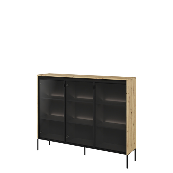 Czarna trzydrzwiowa komoda z witryną 154 cm do salonu ryflowana OLVO