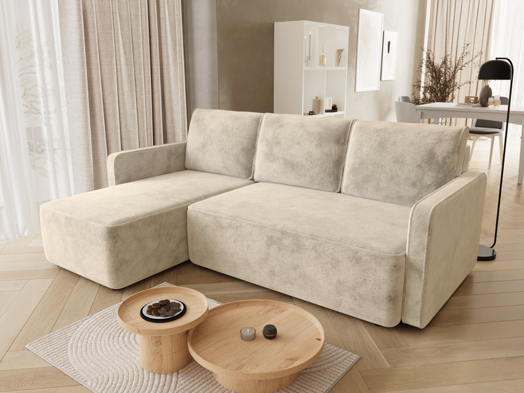 Cenisz sobie komfort i ładny wygląd we wnętrzach? Narożnik NANCY doskonale odnajdzie się w każdym wnętrzu. Prosta forma i eleganckie złote nóżki nadają temu rozkładanemu narożnikowi ponadczasowy design. Strefa wypoczynkowa z narożnikiem Nancy będzie komfortowa, a po rozłożeniu narożnika wyśpią się na nim dwie osoby. Narożnik posiada duży pojemnik na pościel, więc zmieścisz w nim nawet zapasowy komplet pościeli. Narożnik z funkcją spania jest bardzo łatwy w rozłożeniu, ponieważ zastosowano w nim specjalny automat wspomagający rozkładanie. Tył narożnika również jest obity tą przepiękną tkaniną, więc narożnik sprawdzi się jako mebel wolnostojący. Wygodne siedzisko oraz zagłówek pomogą zrelaksować się po ciężkim dniu z kubkiem ulubionej herbaty w ręku. Prezentowany narożnik jest prawostronny, jednak występuje też w wersji lewostronnej.