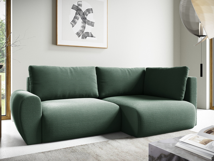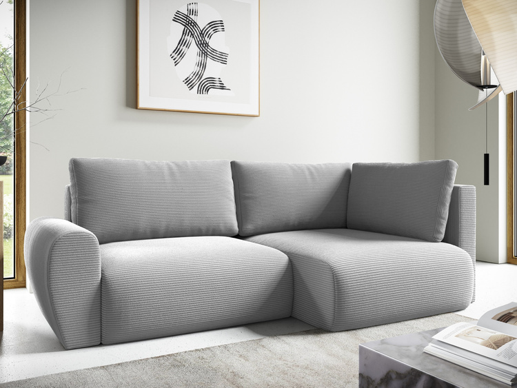 - Charakterystyczne przeszycia na oparciu i podłokietnikach czynią ten narożnik eleganckim,