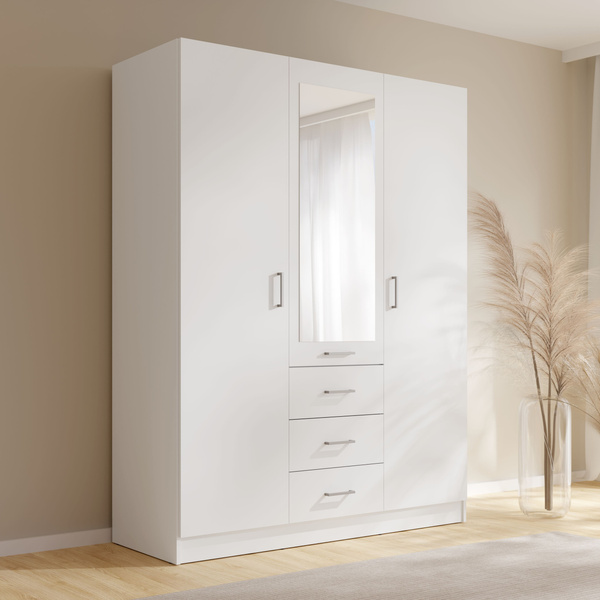 Biała szafa trzydrzwiowa 147 cm z szufladami i półkami BILL